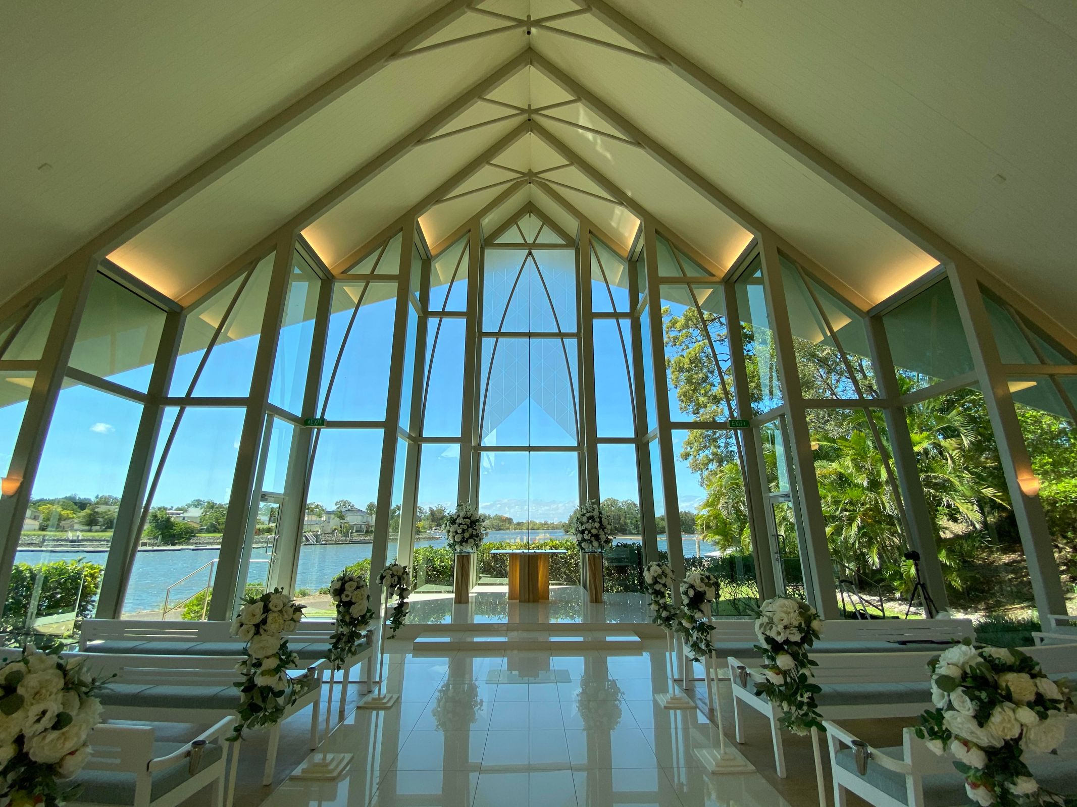 教堂裡的落地玻璃,讓人有一種很高貴典雅的感覺,當新人註冊結婚的時候,可以透過落地玻璃看出去美麗的河景和悠雅的環境。有時候,新人還會有一些特別嘉賓在教堂外面,這些特別嘉賓就是袋鼠。玻璃教堂可以容納120人,設備完善,有儀器供新人們播放音樂,有新娘房間,有洗手間,有空調,有玻璃簽署證書桌子。
